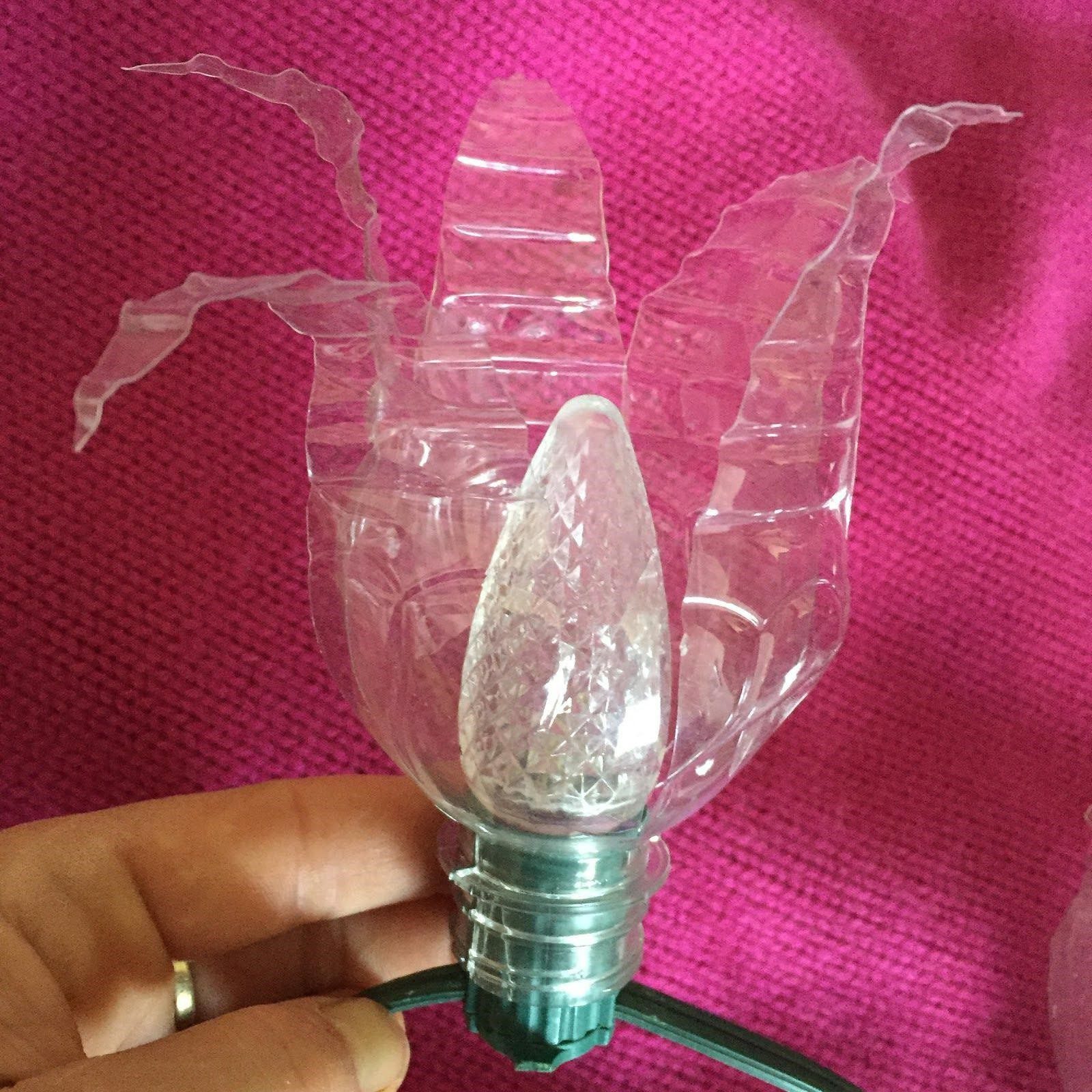 - At Heritage, we used C9 bulbs which fit nicely into the mouth of the bottle, and we cut 2-3 slits in the mouth of the bottle to fit it over the sockets of the C9 stringer wire. We spaced flowers at about 2’ lengths, and bought caps to waterproof the unused sockets.